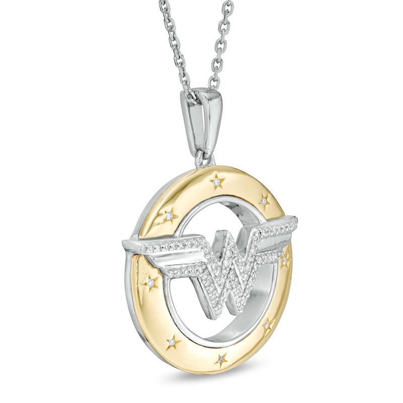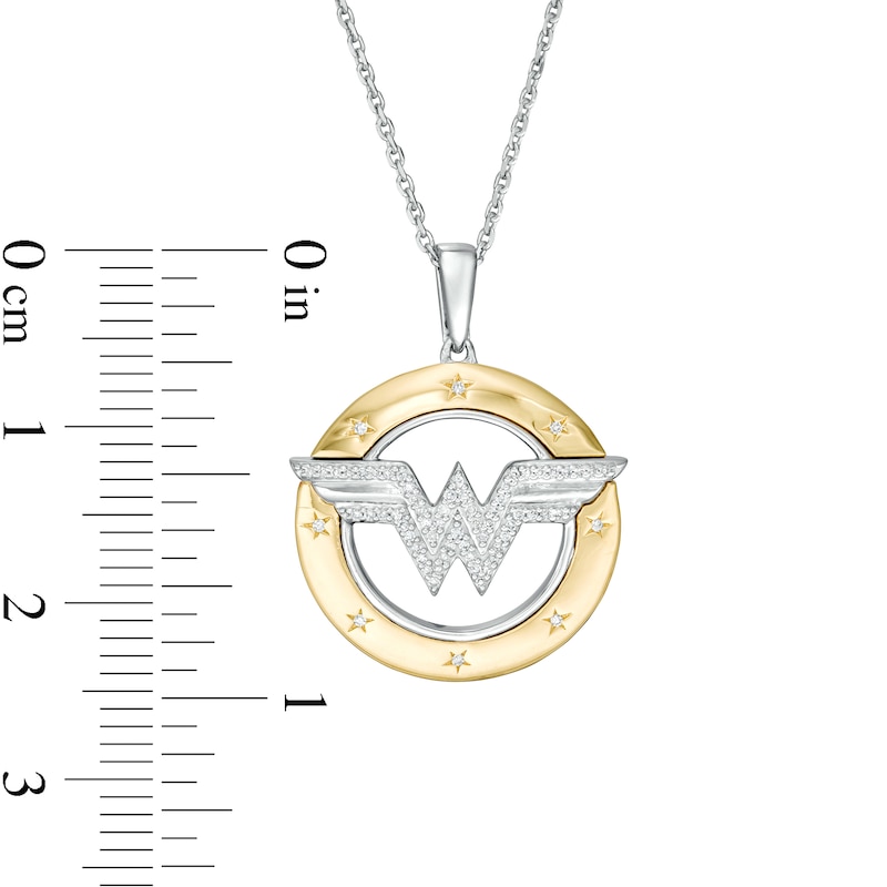 Created in sterling silver and 10K gold, this bold design showcases the "WW" logo sculpted in silver and shimmering with diamonds. Etched diamond-touched stars twinkle along the wide gold rim of the open circle border while the slim silver interior highlights the center. Captivating with 1/10 ct. t.w. of diamonds and a bright polished shine, this pendant suspends along an 18.0-inch cable chain, with an additional closure ring at 16.0 inches, that secures with a spring-ring clasp.This exclusive fine jewelry collection inspires you to wear your strength, confidence and power.