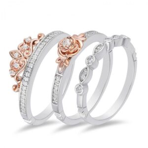 Romance is in the air with this entrancing stackable diamond ring set . Crafted in sterling silver and 10K rose gold, each ring in this ensemble is elegant on its own or when worn together The first ring features a diamond-touched band and a scroll-worked crown, the second showcases a diamond-centred rose with leaves on a diamond-lined shank, and the third shimmers with diamonds in round and marquise-shaped frames Small crown insets lower on the shank complete this magical design Captivating with 018 ct tw of diamonds and a brilliant buffed lustre, this three-piece set is fashioned in sterling silver and 10K rose gold This set is available in size 7 only
