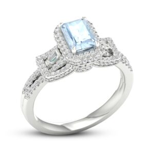 Unforgettable and whimsical, this romantic diamond engagement ring is a perfect way to show your everlasting love. The ring is styled in 10K white gold and features an enchanting emerald-cut aquamarine gemstone in the center. Sparkling round and baguette-cut diamonds perfectly frame the sides of the aquamarine gemstone and grace the band to give the ring a total diamond weight of 1/2 carat.