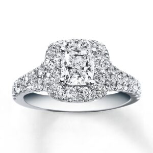 Breathtaking round diamonds surround a cushion-cut diamond in this romantic engagement ring. The 14K white gold band is awash with additional round diamonds for a dramatic effect. The ring has a total diamond weight of 2 1/6 carats.