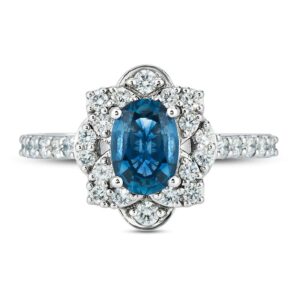 Please note: This ring is available in limited sizes. If you dont see your size here, please visit a store to order your ring.This enchanting ring features a beautiful natural Blueberry Sapphire haloed by irresistible Vanilla Diamonds set in powerful platinum. Additional Vanilla Diamonds line the band to complete the look. The total diamond weight of the ring is 5/8 carat.